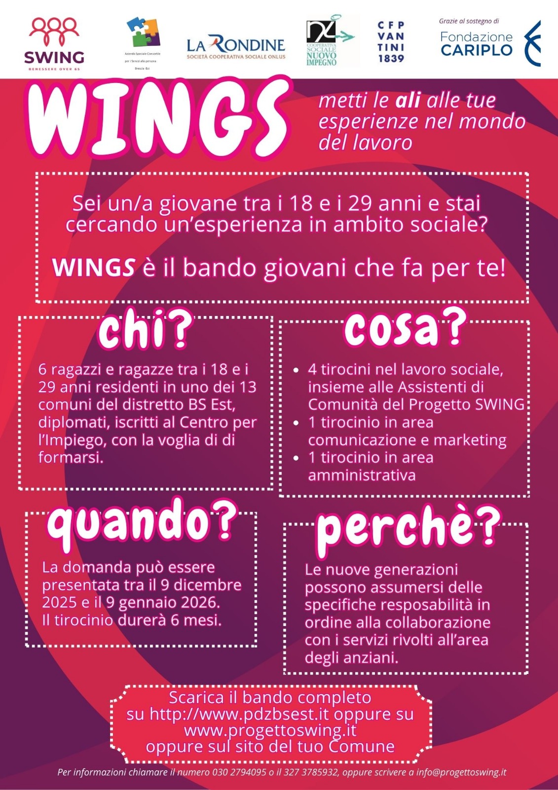 I sei percorsi sono stati così identificati: 4 tirocini nell’area del lavoro sociale, in affiancamento alle operatrici Assistenti di Comunità; WINGS - Metti le ali alle tue esperienze nel mondo del lavoro B A N D O G I O V A N I per la partecipazione a percorsi formativi e di tirocinio 2 1 tirocinio nell’area comunicazione e marketing, in affiancamento alla responsabile della comunicazione di progetto; 1 tirocinio nell’area amministrativa, in affiancamento alle attività di rendicontazione del progetto. I percorsi avranno la seguente articolazione: - formazione in tema di sicurezza sul lavoro (8 ore obbligatorie) - orientamento e monitoraggio (10 ore obbligatorie) - 6 mesi di tirocinio per 20/25 ore settimanali (indicativamente gennaio /giugno 2026) I percorsi si intendono completati a fronte di una presenza registrata del 70%